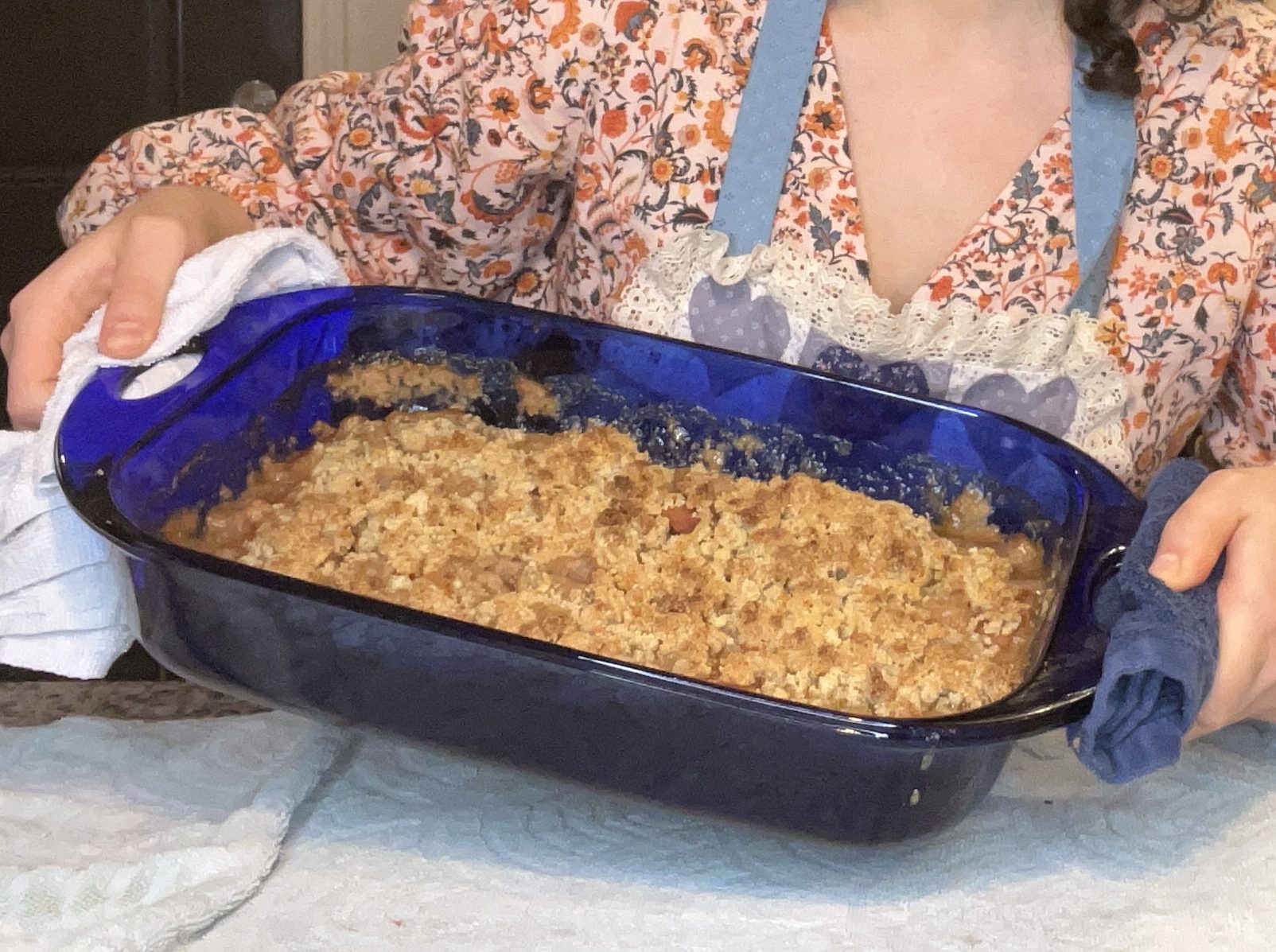 - Place the baking dish in the preheated oven and bake for 25-30 minutes, or until the crumble topping is golden brown and crispy.